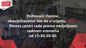 Poštovani članovi, obavještavamo Vas da u srijedu, 18.11.2020 naši fitness centri rade prema nedjeljnom radnom vremenu od 15:30 do 20:30…
